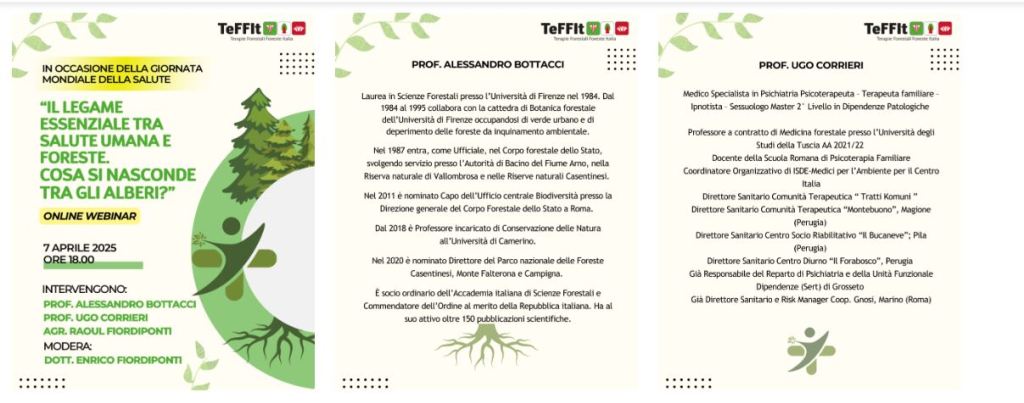 Esperti come il Prof. Alessandro Bottacci e il Prof. Ugo Corrieri parleranno del valore reale delle Foreste per il pianeta, della relazione tra uomo e foresta, degli effetti sulla nostra salute e di Terapie Forestali e Immersioni in Foresta e molto altro.